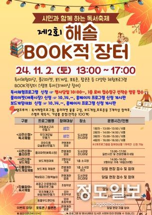 (정도일보) 시민과 함께 하는 독서문화축제 ‘2024 해솔북(BOOK)적 장터’가 11월 2일 파주시 해솔도서관 일대에서 열린다.