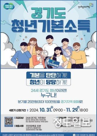 (정도일보) 파주시는 10월 31일부터 11월 29일까지 청년의 사회참여 촉진 및 사회적 기본권 보장을 위한 ‘2024년 4분기 경기도 청년기본소득’ 신청을 받는다.