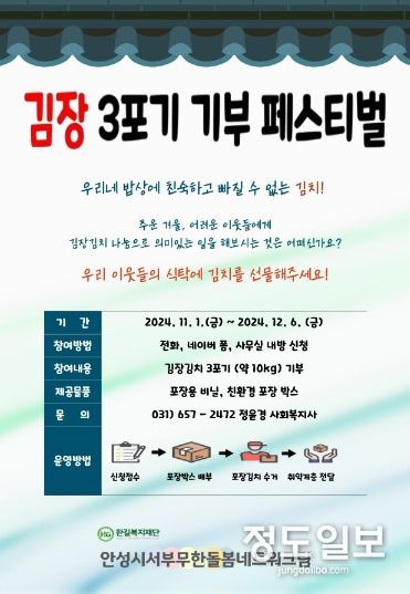 (정도일보) 사회복지법인 한길복지재단에서 수탁 운영 중인 안성시서부무한돌봄네트워크팀은 오는 11월 1일부터 12월 6일까지 ‘김장 3포기 기부 페스티벌’ 행사에 동참할 안성시민, 지역기관·단체의 신청을 받는다.