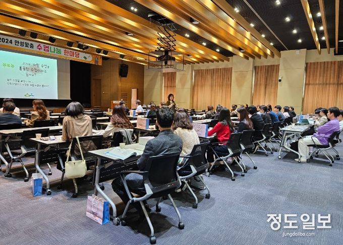 (정도일보) 안성교육지원청은 10월 4주부터 10월 5주를 수업나눔한마당 집중 주간으로 운영하여 관내 초・중등 교원 100여 명을 대상으로 공개 수업과 수업 사례 나눔을 실시했다. ‘안성맞춤 수업나눔한마당’은 미래 사회 역량을 강화하기 위해 학생의 삶과 연계된 깊이있는 수업을 확산하고자 마련된 행사이다.