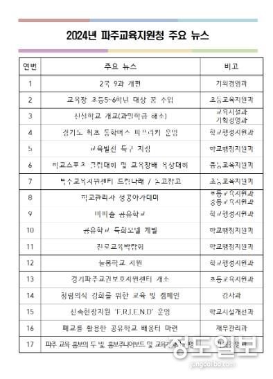 선정될 주요 뉴스 후보로는 '2국 9과 개편을 통한 행정 효율성 강화', '경기도 최초의 통학버스 파프리카 운영으로 학생 교통 편의 증대', '특수교육지원센터 드림나래와 놀고잡고 프로그램을 통한 특수교육 지원 확대', '교권 보호를 위한 경기파주교권보호지원센터 개소', '폐교를 활용한 공유학교 운영으로 지역 자원의 효율적 활용' 등이 포함되어 있다. 이러한 성과들은 지역 사회와 교육 공동체에 의미 있는 변화를 가져왔으며, 앞으로도 파주 교육 발전의 초석이 될 것이다.