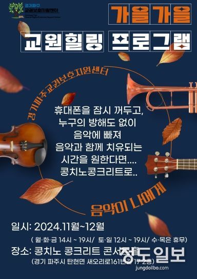 (정도일보) 경기도파주교육지원청은 11월 11일(월)부터 12월까지 경기파주교권보호지원센터의 주관으로 ‘가을가을 교원 힐링 프로그램’을 운영한다고 밝혔다.