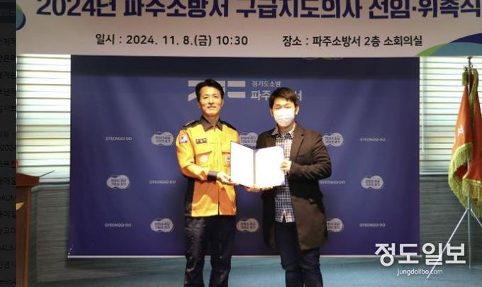 (정도일보) 파주소방서는 오는 11월 8일 구급서비스 전문성 강화와 구급대원 응급의료 서비스 품질향상을 위해 경기도의료원 파주병원 응급의학과 류형선 과장을 구급지도의사로 위촉했다고 밝혔다.