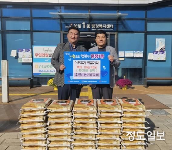 (정도일보) 파주시 다율동에 위치한 큰기쁨교회는 지난 8일 백미 10kg 40포(100만 원 상당)를 홀몸 어르신 등 어려운 이웃들을 위해 사용해 달라며 운정1동 행정복지센터에 기탁했다.