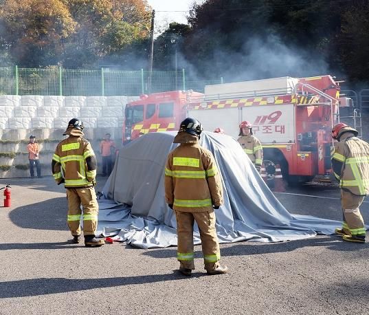 소방 교육에서는 소방관이 직접 소화기 사용 방법과 피난 대피 요령 등 화재 대비 교육을 진행했으며, 질식소화포(덮개), 이동식 수조 등 전기차 화재 진압용 장비를 활용해 전기차 배터리 화재를 효과적으로 진압하는 방법을 시연했다.