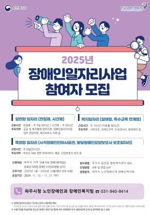(정도일보) 파주시는 11월 13일부터 21일까지 장애인의 사회참여 확대와 소득 안정을 지원하기 위해 2025년 장애인일자리사업 참여자를 모집한다.