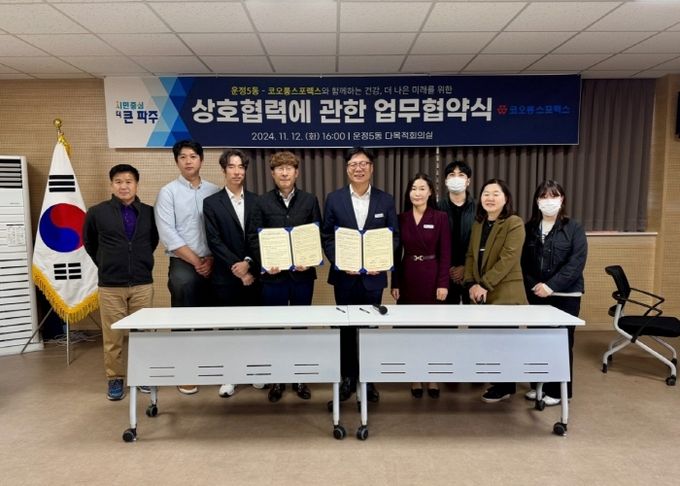 이날 협약식에는 이창훈 운정5동장과 코오롱스포렉스 파주 사업팀장 등 주요 관계자들이 참석해 운정5동 주민들의 건강 증진과 지역사회 활성화를 위한 상호 협력을 다짐했다.