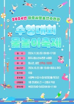 (정도일보) (재)파주시청소년재단 파주시청소년수련관은 2024년 11월 30일, 수영대회와 물놀이축제를 동시에 개최한다고 밝혔다. 이번 행사는 수영대회와 물놀이축제가 오전과 오후에 걸쳐 진행된다. 오전에는 개인전과 팀전, 시상식으로 나뉘어 수영대회가 진행되며, 오후에는 물놀이축제가 열려 온 가족이 함께 즐길 수 있는 다양한 프로그램이 준비된다.