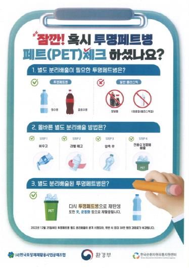 심재우 자원순환과장은 “투명페트병 분리배출이 자원순환 정책에 중요한 역할을 한다“라며 시민들의 적극적인 참여를 당부했다.