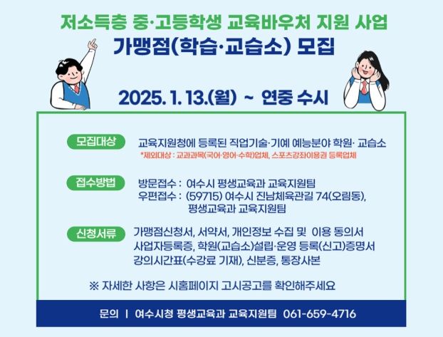 (정도일보) 여수시가 2025년 저소득층 중·고등학생 교육바우처 지원 사업에 참여할 가맹점을 이달 13일부터 연중 수시 모집한다.