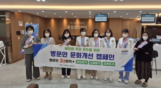 참여자들은 병원 방문객에게 ▲확인하기(방문 가능 시간, 허용 인원, 장소) ▲자제하기(감염성 질환자, 노약자 방문 자제) ▲지켜주기(병문안 전후 개인위생 수칙 준수) 등 병문안 3대 원칙을 안내하고 마스크 착용을 당부했다.