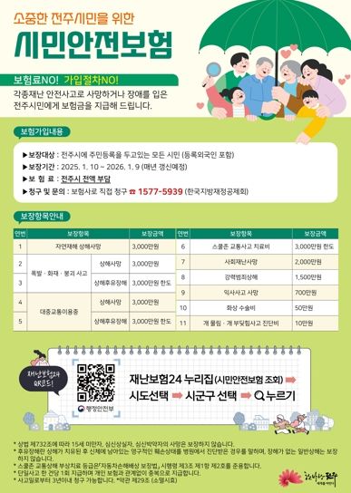 2025년 전주시 시민안전보험 보장기간은 내년 1월 9일까지이며, 청구 서류·방법 등 자세한 내용은 시민안전보험 콜센터로 문의하거나 전주시 누리집에서 ‘시민안전보험’을 검색하면 확인할 수 있다.
