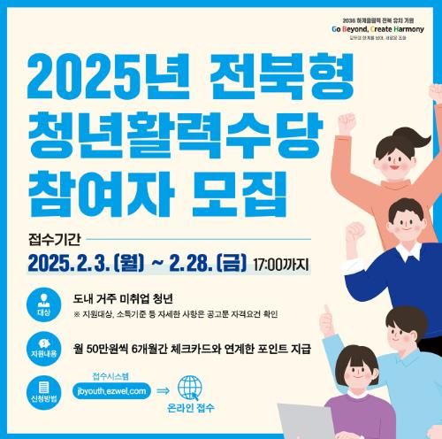 (정도일보) 정읍시가 미취업 청년의 구직활동을 지원하기 위해 전북형 청년활력수당 지원사업 참여자를 2월 3일부터 28일까지 모집한다.