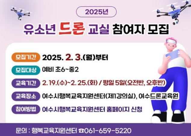 (정도일보) 여수시 행복교육지원센터에서 유소년 드론 교실에 참여할 관내 예비 초6~중2 학생 30명을 선착순 모집한다.
