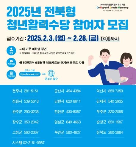 (정도일보) 4일 군산시는 미취업 청년들이 구직활동을 원활히 이어갈 수 있도록 실질적인 구직지원금을 제공하는 ‘2025년 전북형 청년활력수당 지원사업’참여자를 모집한다고 밝혔다.