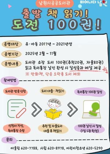 (정도일보) 남원시공공도서관에서는 어린이들에게 책 읽기의 즐거움과 독서 습관 형성을 위하여 2월부터 11월까지 ‘출발 책 읽기 도전 100권’ 프로그램을 운영한다.