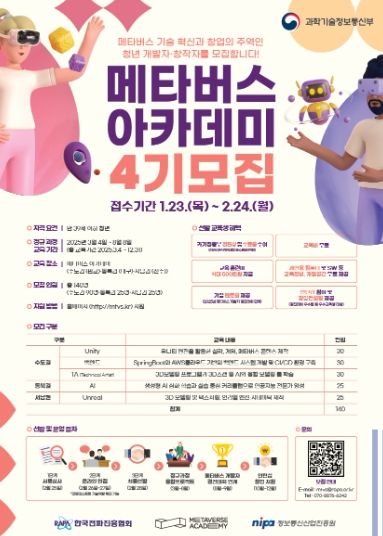 이 사업은 최신 메타버스 기술과 콘텐츠 제작 역량을 갖춘 핵심 인재를 양성하기 위한 것으로, 시와 진흥원은 메타버스산업에 관심이 있는 서남권 재직자와 대학생, 취업준비생 등 만 39세 이하 청년 25명을 선발해 오는 3월부터 8월까지 교육을 운영할 예정이다.