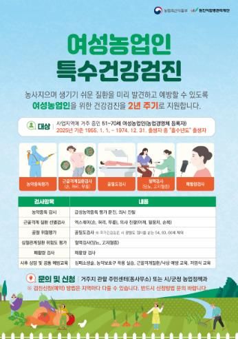 군 관계자는 “농업과 가사 노동을 병행하는 여성농업인은 농작업성 질환 발병률이 높아 미리 진단하고 대비하는 것이 중요하다”며, “올해 대상이 되는 여성농업인들의 많은 신청을 바란다”고 말했다.
