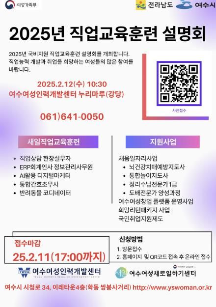 (정도일보) 여수여성인력개발센터가 오는 12일 오전 10시 30분, 센터 4층 누리마루 강당에서 ‘2025년 직업교육훈련 설명회’를 개최한다.