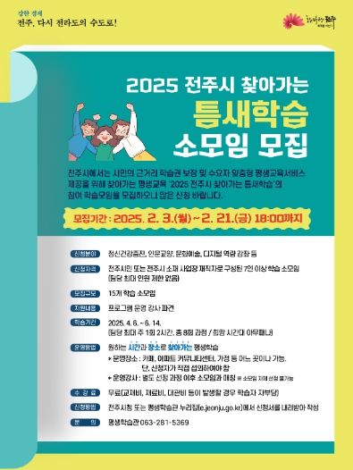 전주시는 오는 21일까지 ‘2025 전주시 찾아가는 틈새학습’에 참여할 15개 소모임을 공개 모집한다고 11일 밝혔다.