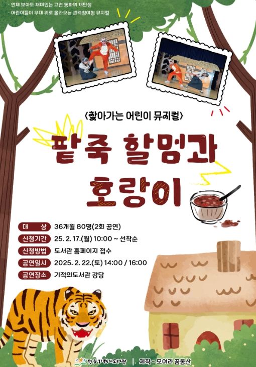 (정도일보) 정읍기적의도서관이 2월 ‘문화가 있는 날’을 맞아 가족 뮤지컬 ‘팥죽 할멈과 호랑이’를 무료로 공연한다.