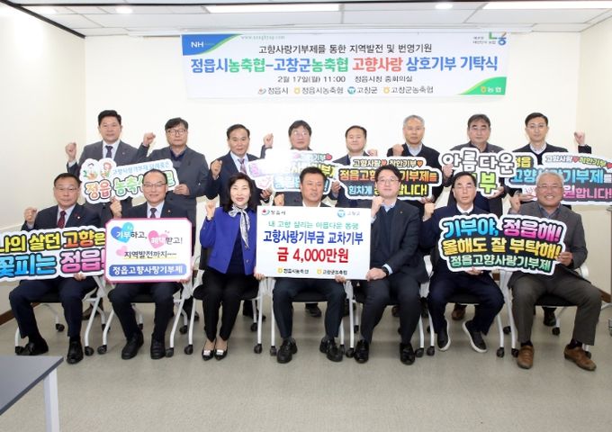 정읍시와 고창군 농축협 조합장들은 17일 정읍시청에서 고향사랑기부금 상호 기부식을 열었다.