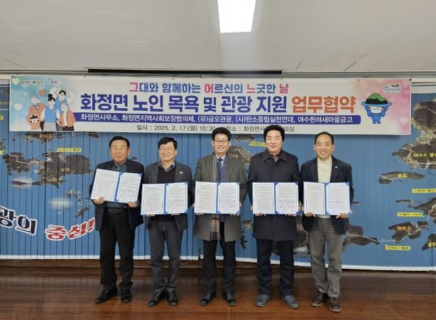 협약에 따라 화정면사무소와 화정면 지역사회보장협의체는 참여 어르신 발굴을, (유)금오관광은 차량 지원을, (사)탄소중립실천연대와 여수한려새마을금고는 봉사 인력과 관련 비용을 지원한다.