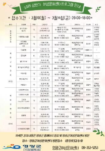교육기간은 3월부터 6월까지 운영되며 과목별 수업시간 및 수업내용은 영광군 누리집(홈페이지) 게시판을 통해 확인할 수 있고, 기타 자세한 사항은 여성문화센터 또는 영광군 가정행복과로 문의하면 된다.