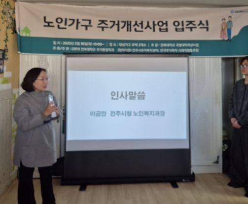 시는 18일, 덕진구 금암2동 임○○어르신 댁에서 이금안 노인복지과장, 배현표 한국주거복지사회적협동조합사무처장, 최병숙·장미선 전북대학교 주거환경학과 교수 및 학생 20여 명과 함께 주거환경 개선사업 입주식을 개최했다.