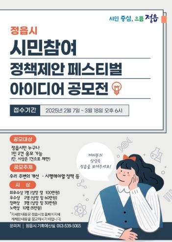 (정도일보) 정읍시가 시민이 직접 참여하고 공감할 수 있는 정책 발굴을 위해 ‘시민 정책제안 공모전’을 개최한다.