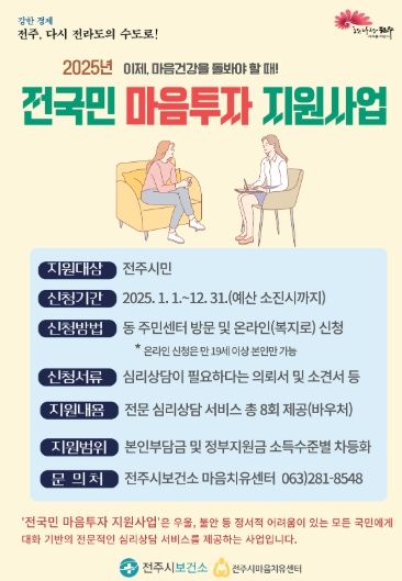 (정도일보) 전주시보건소는 다양한 이유로 인해 마음의 돌봄이 필요한 시민을 위한 ‘전국민 마음투자 지원사업’을 올해도 지속 추진할 계획이라고 20일 밝혔다.