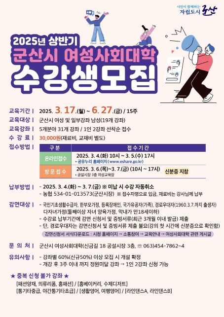 자세한 사항은 군산시 누리집을 확인하거나 여성사회대학으로 문의하면 된다.