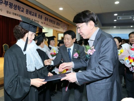 전주주부평생학교는 26일 우범기 전주시장과 남관우 전주시의회 의장, 졸업생 가족, 재학생과 교사 등이 참석한 가운데 ‘제9회 초·중등학력 인정 졸업식’을 개최했다.