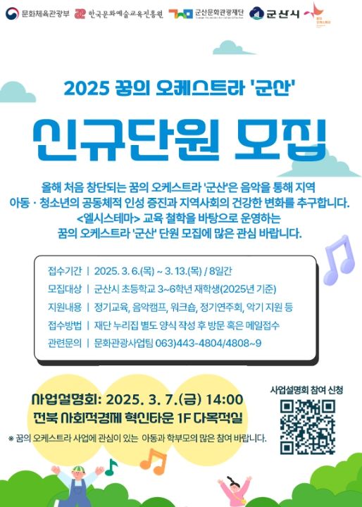 (정도일보) 군산문화관광재단이 2025년 꿈의 오케스트라 ‘군산’의 본격적인 출범에 앞서 신규단원을 모집한다.