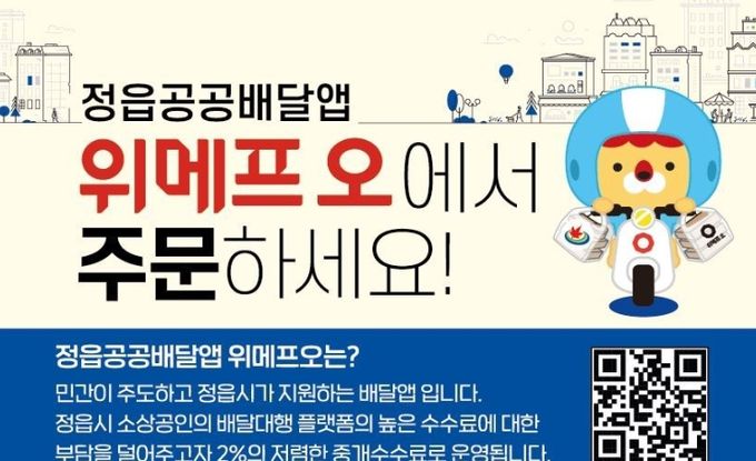 (정도일보) 정읍시가 소상공인의 경제적 부담을 줄이고 민생경제를 활성화하기 위해 공공배달앱 ‘위메프오’에서 3월 한 달간 특별 할인 이벤트를 진행한다.