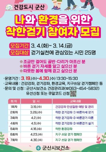 (정도일보) 군산시보건소가 ‘나와 환경을 위한 착한 걷기’ 프로그램 참여자를 모집한다.