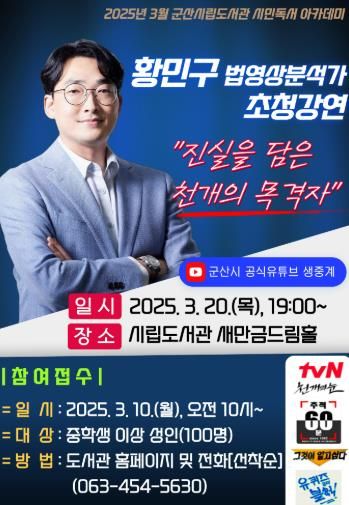 (정도일보) 군산시립도서관은 20일 오후 7시 ‘2025년 시민독서 아카데미 첫 강연’의 막을 연다.