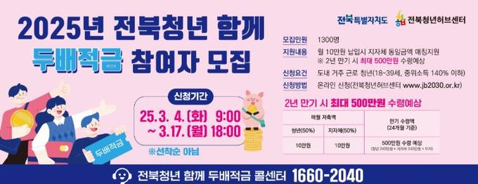 신청은 ‘전북청년 함께 두배적금’ 홈페이지에서 온라인으로만 가능하다.