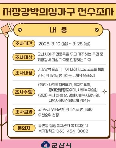 이번 전수조사는 27개 읍면동 행정복지센터에서 ▲이·통장 ▲명예사회복지공무원 ▲우리동네 홍반장 ▲읍면동지역사회보장협의체 위원들과 함께 진행한다.