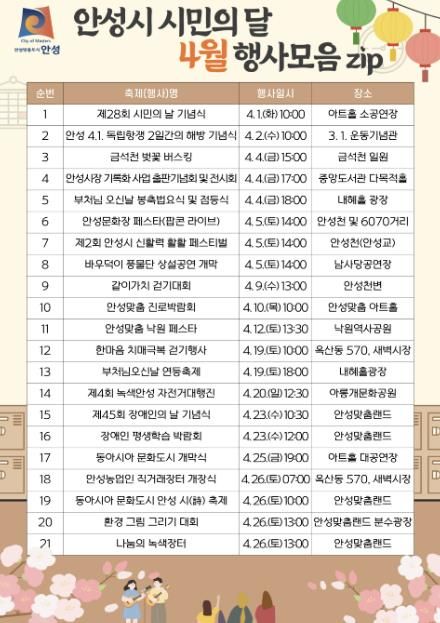 특히 안성시는 시민과 함께 시민의 날을 기념하고 축하할 수 있도록, 4월에 다채로운 행사를 기획하고 있다. 4월 1일 ‘시민의 날 기념식’을 시작으로 4월 2일에는 ‘2일간의 해방 기념식’, 4월 4일에는 ‘금석천 벚꽃 버스킹’, 4월 5일에는 ‘안성문화장 페스타(팝콘라이브)’ 등 4월 말까지 20여 개의 다양한 행사가 개최될 예정이다.