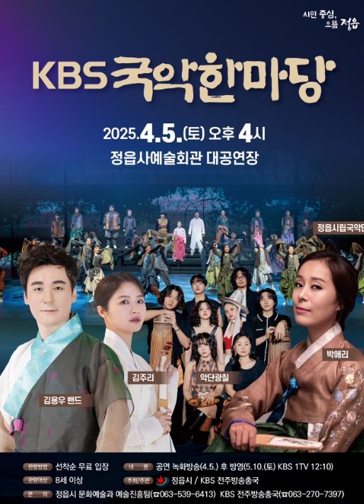 (정도일보) 정읍시가 다채로운 국악의 매력을 시민들과 함께 나눈다. 오는 5일 오후 4시, 정읍사예술회관에서 KBS ‘국악한마당’ 공개 녹화 공연이 열린다.