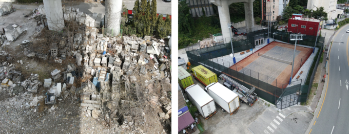 용인특례시 기흥구가 신갈동 537-85번지 고가도로 하부를 시민편의시설로 조성한 모습. 사진은 조성 전(왼쪽)과 조성 후(오른쪽) [사진=용인특례시]