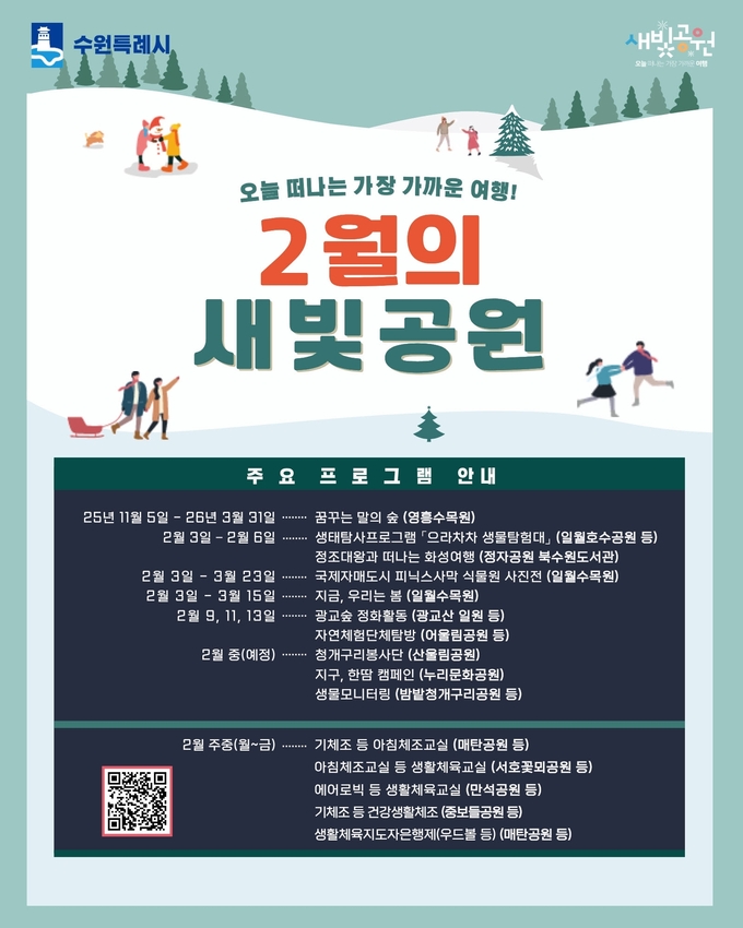 수원시 관계자는 “겨울철에도 시민들이 공원을 찾으며 자연과 교감하고 건강한 여가를 즐길 수 있도록 다양한 프로그램을 마련했다”며 “공원이 일상에서 더 친근한 생활 공간으로 자리 잡을 수 있도록 지속해서 노력하겠다”고 말했다.
