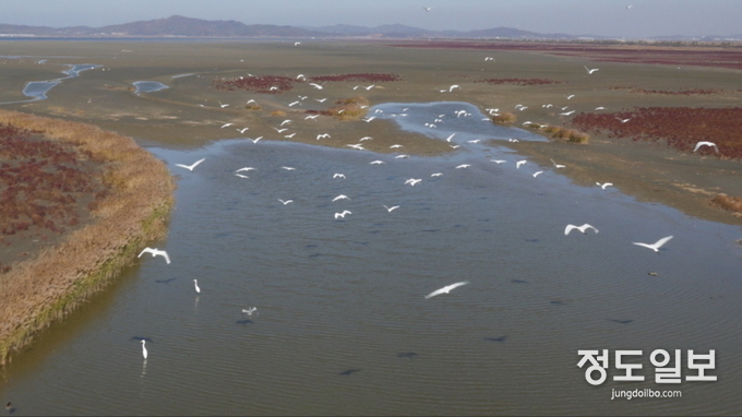 화성호 내륙습지 갈대밭과 철새 모습 드론 촬영 모습