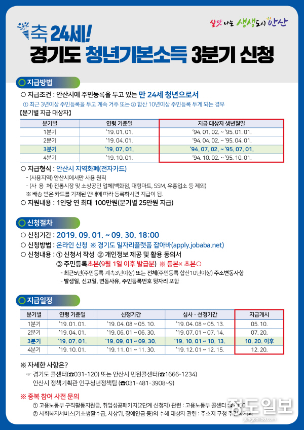 (정도일보) 안산시는 청년의 사회 참여를 높이고 사회적 기본권 보장을 위한 청년기본소득의 올 3분기분 접수를 9월 한 달 동안 실시한다고 26일 밝혔다.