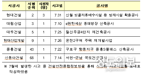 (정도일보) 국토교통부는 시공능력평가 상위 100위 건설사 중에서 지난 7월 한 달 동안 사망사고가 발생한 회사의 명단을 공개했다.