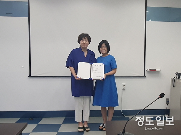 (주)영신에프앤에서 박순화 대표(좌), 청곡종합사회복지관 김순애 관장(우)