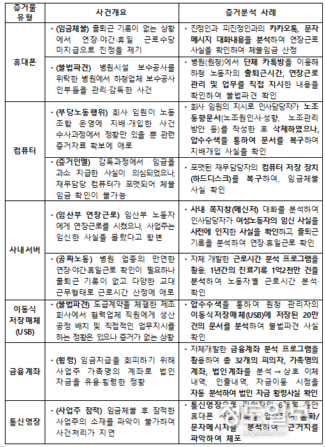 이에 고용노동부는 ‘근로감독행정 종합 개선방안’의 일환으로 디지털 증거 분석을 통하여 법 위반 사실을 밝혀낸 우수사례를 모아 ‘디지털 증거 분석 사례집’을 발간했다.