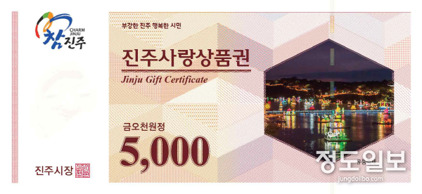 지역 내 소비촉진과 소상공인의 매출 증대를 위해 만든‘진주사랑 상품권’은 5,000원 권, 10,000원 권 2종 10억 원 규모로 발행되며, 상품권 출시기념 및 추석명절을 맞아 10억 원 중 8억 원의 상품권에 대하여는 10% 할인 판매한다.