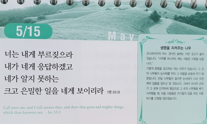 “저 절벽 중간에 뻗어 나온 나무가 보이십니까?" "네." “그럼, 벼랑에서 떨어지다 저 나무를 붙잡았다고 생각해 보십시오. 어떻게 하시겠습니까?” "죽을힘을 다해 나뭇가지를 붙들고 있겠지요." “그게 바로 믿음입니다. 손을 놓으면 떨어져 죽는다는 것을 알고 나무를 꼭 붙잡듯이 인생 가운데 하나님만 붙들고 있어야 합니다.”
